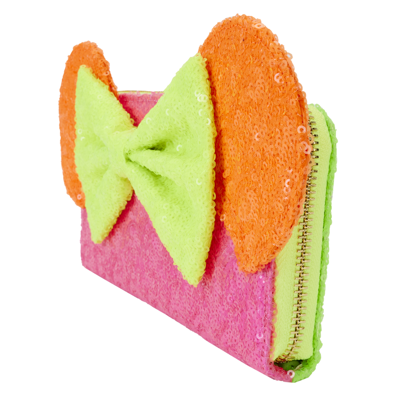 This fashionista is all about color! Turn the brightness up a notch with the Exclusive Loungefly Minnie Neon Sequin Color Block Zip Around Wristlet Wallet. Featuring a vibrant color-blocked design, this wallet is covered in dazzling sequins for a little extra sparkle. Minnie’s ears appear on the front of the wallet, where a three-dimensional bow sits between them. A detachable wrist strap makes it easy to carry your essential items. This accessory makes a bright and shining addition to any outing and is perfect for anyone looking to stand out.