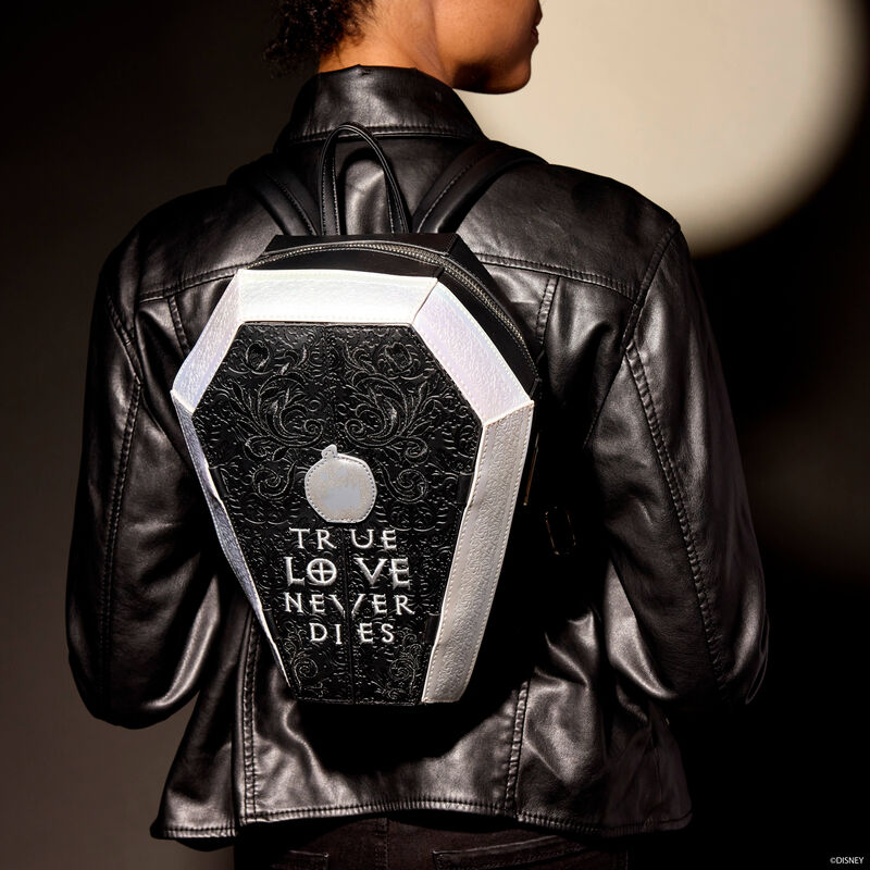 ‘Til death, and forever after. Celebrate the love of an afterlife-time with Jack and Sally, who appear on this coffin-shaped mini backpack. Lift the bag’s magnetic flaps to reveal the couple waiting inside. With shiny metallic features and an embroidered epitaph, this accessory makes a swoon-worthy addition to any outfit.